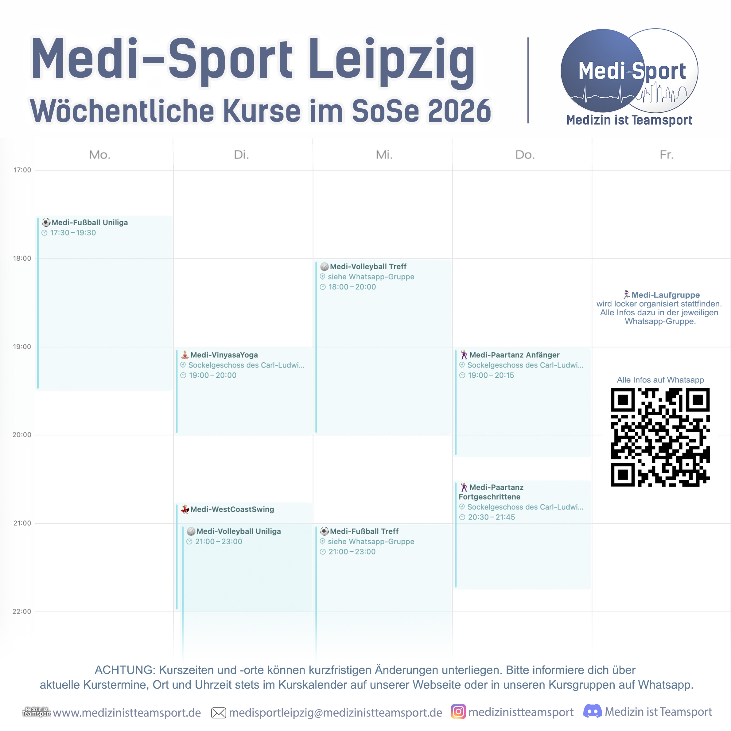 MEDIZIN IST TEAMSPORT – dies ist das Motto der größten studentischen Arbeitsgruppe der Medizinischen Fakultät der Universität Leipzig: willkommen beim Medi-Sport Leipzig. Egal ob Human-, Zahn-, Veterinärmedizin oder Pharmazie – gemeinsam wollen wir neben dem Studium sportlich aktiv sein und im TEAM tolle Momente erleben.